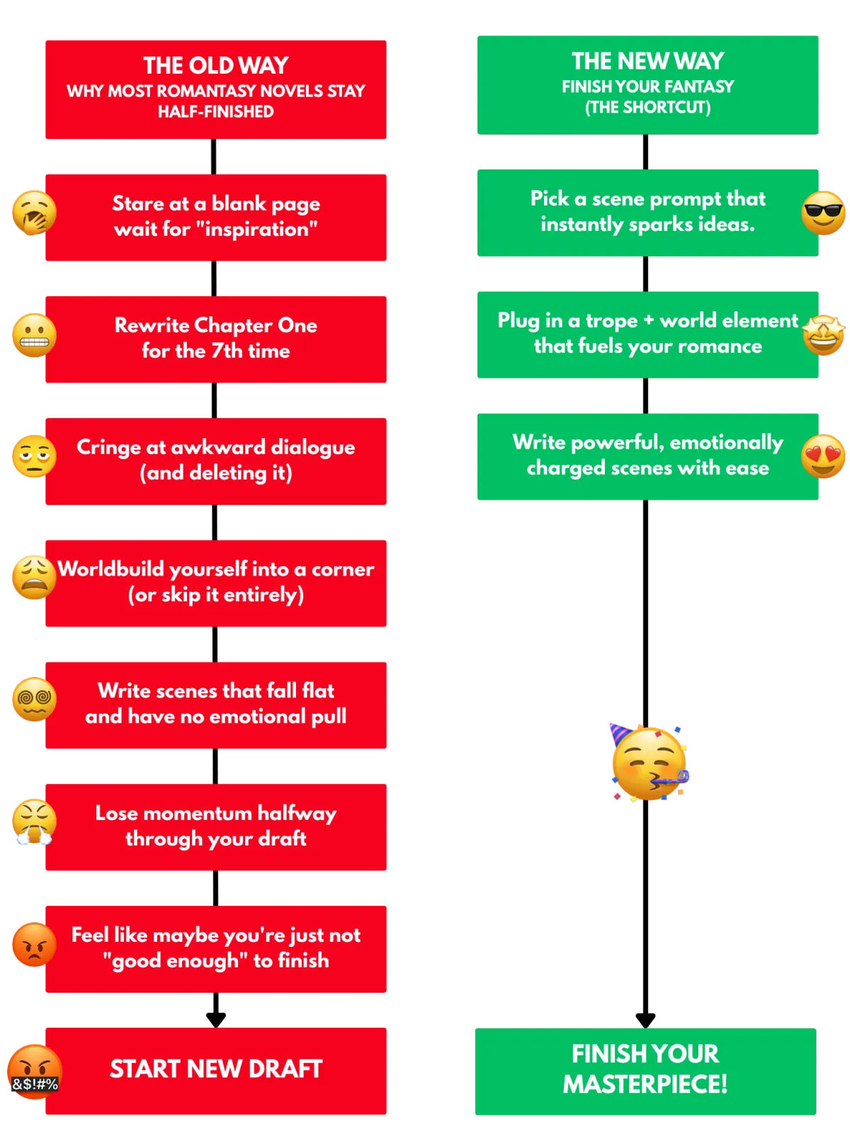 Instead, what you ACTUALLY need is a proven plug-and-play system — one that gets you writing real scenes fast, builds romantic tension naturally, and lets you shape your world without getting buried in it.